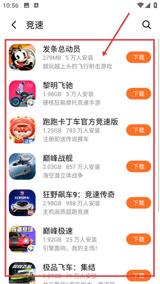 4、进入竞速游戏列表页,能看到多款竞速类游戏,点击对应游戏旁的【下载】按钮就能开始安装啦。