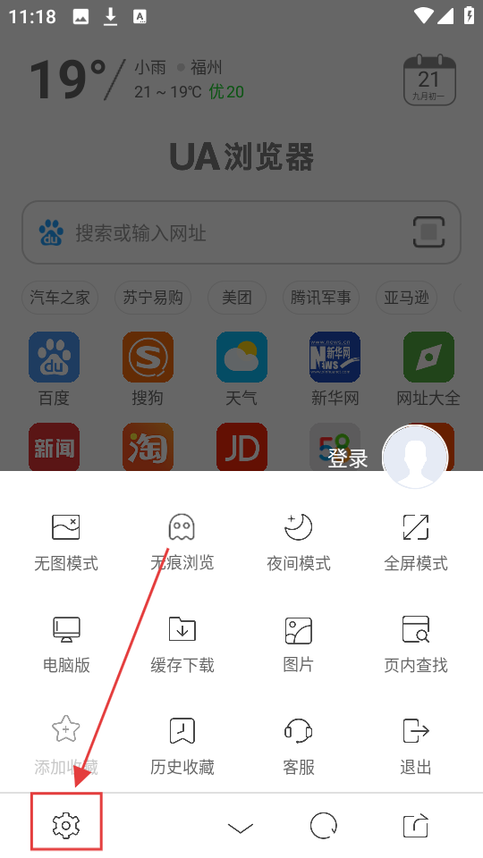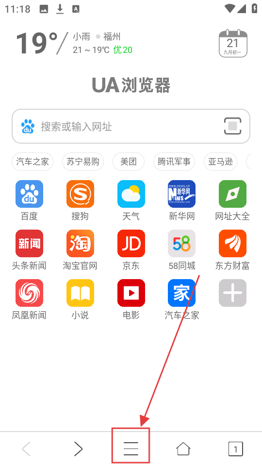 1、我们打开UA浏览器,若想进行设置相关操作,点击底部的菜单按钮,就能展开功能菜单啦。