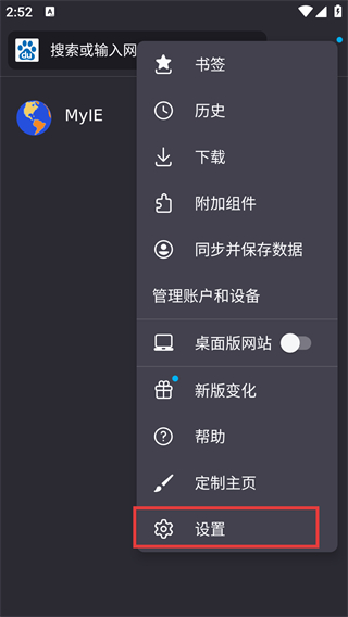 2、菜单列表中找到【设置】选项,点击进入浏览器设置页面。