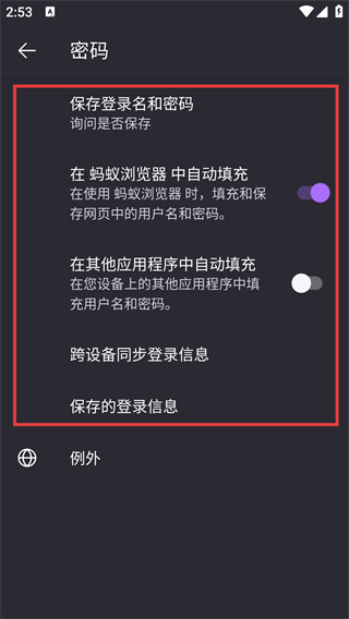 4、密码设置页可配置【保存登录名和密码】【在蚂蚁浏览器中自动填充】等密码相关功能选项。