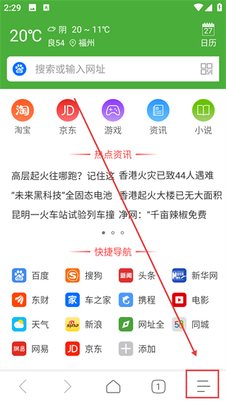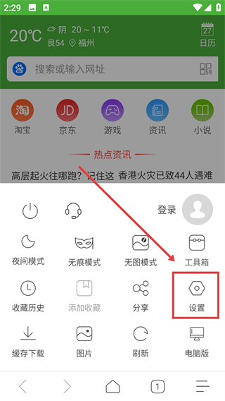 1、在浏览器首页,点击底部的菜单按钮,展开功能选项列表,能找到设置相关入口来调整应用配置啦。
