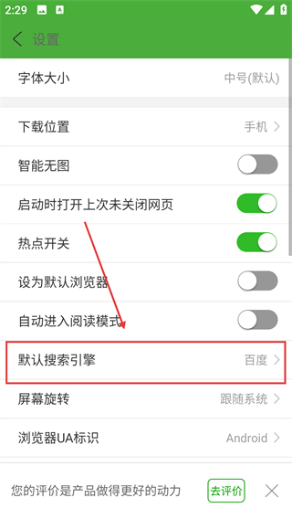 3、进入设置界面后,点击【默认搜索引擎】选项,跳转至搜索引擎选择页面,能更换默认的搜索工具呀。