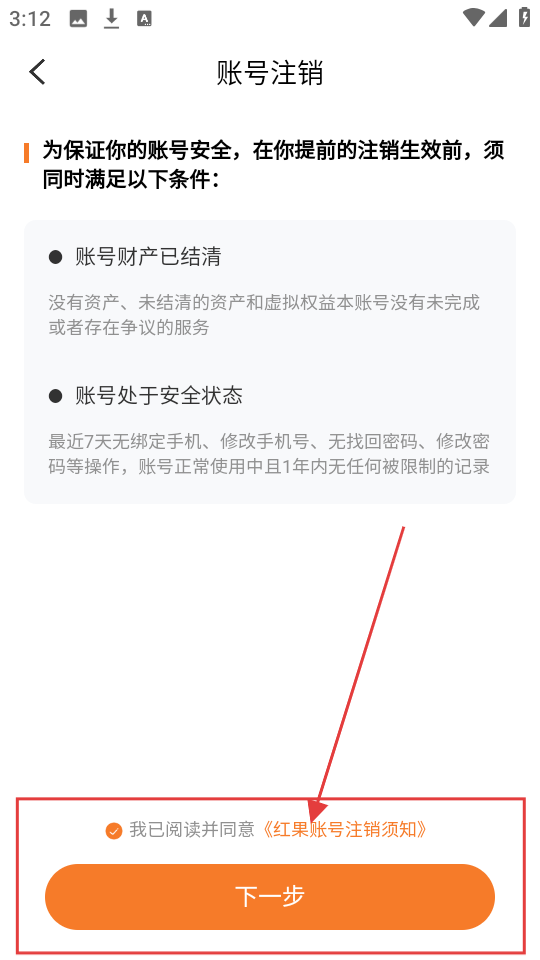 4、在账号注销界面勾选同意须知后,点击【下一步】,就能继续完成账号注销流程啦。