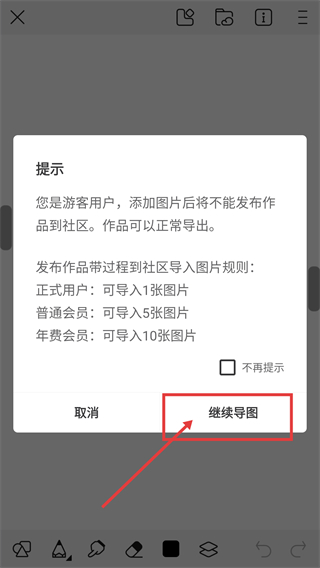 3、看到游客用户提示弹窗后,点击【继续导图】按钮,就能忽略提示继续导入图片素材哦。