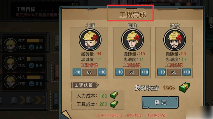 4、等待一段时间工程完成,我们就能成功获得任务奖励,并且顺利通过打工者挑战。
