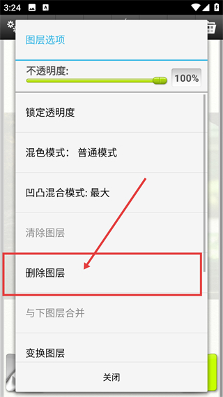 3、在图层选项里点【删除图层】,就能移除当前选中的图层,让绘画界面更简洁清爽啦。