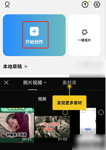 1.首先点击首页的开始创作进行视频剪辑,点击创作后,需要先选择你需要导出字幕的素材视频,进入编辑页;