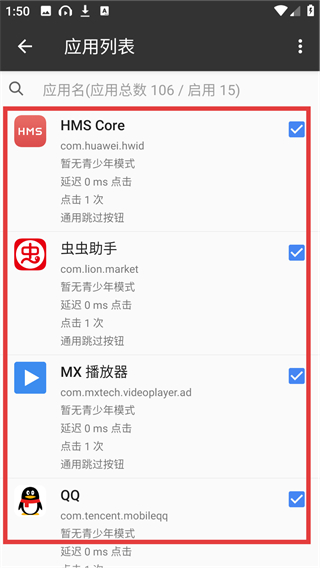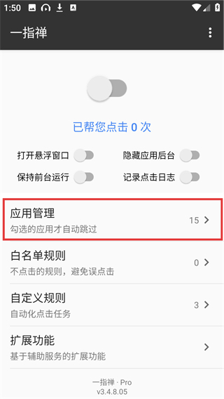1、在一指禅主界面点【应用管理】选项,能进入应用列表界面,可管理各应用的自动跳过规则啦。
