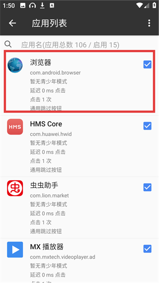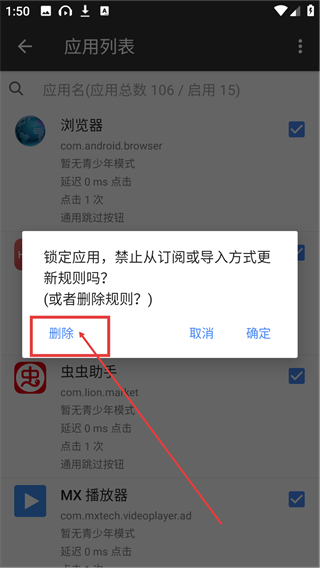 3、长按目标应用如【浏览器】,会弹出操作弹窗,点【删除】就能移除该应用的自动跳过规则啦。