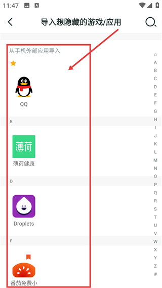2、进入导入页面后,选择要隐藏的应用比如【QQ】,就能将它添加到当前隐藏列表中哦。