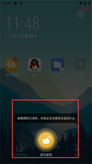 4、安全退出后桌面图标会消失,界面显示【请先解锁】提示,说明应用已成功隐藏啦。