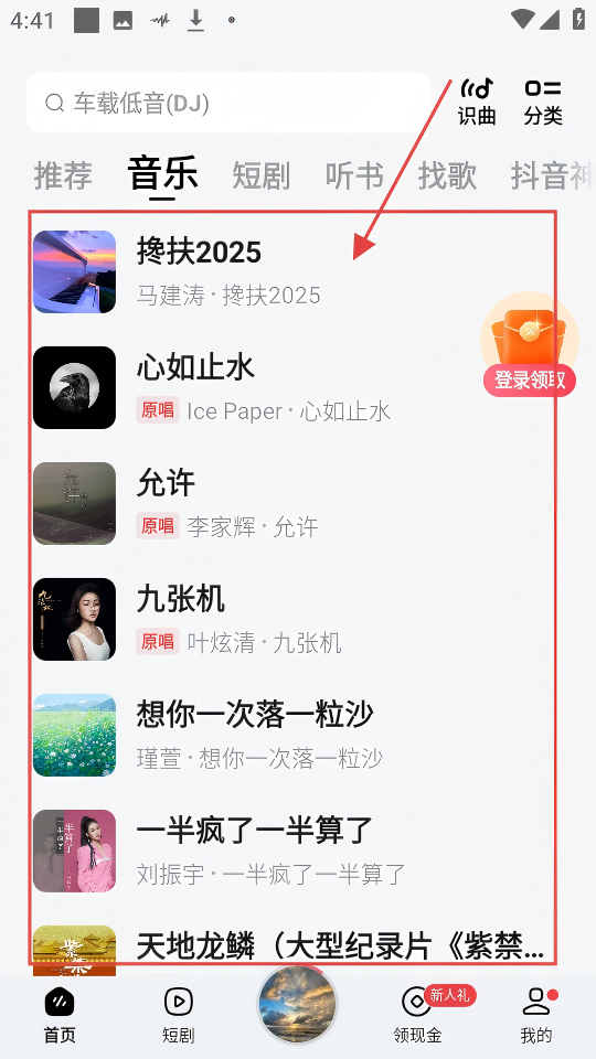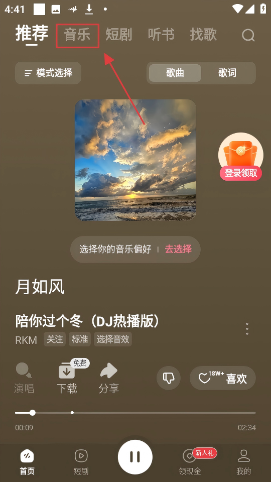 1、在首页顶部,点击【音乐】选项,就能进入音乐页面,开启音乐之旅啦。