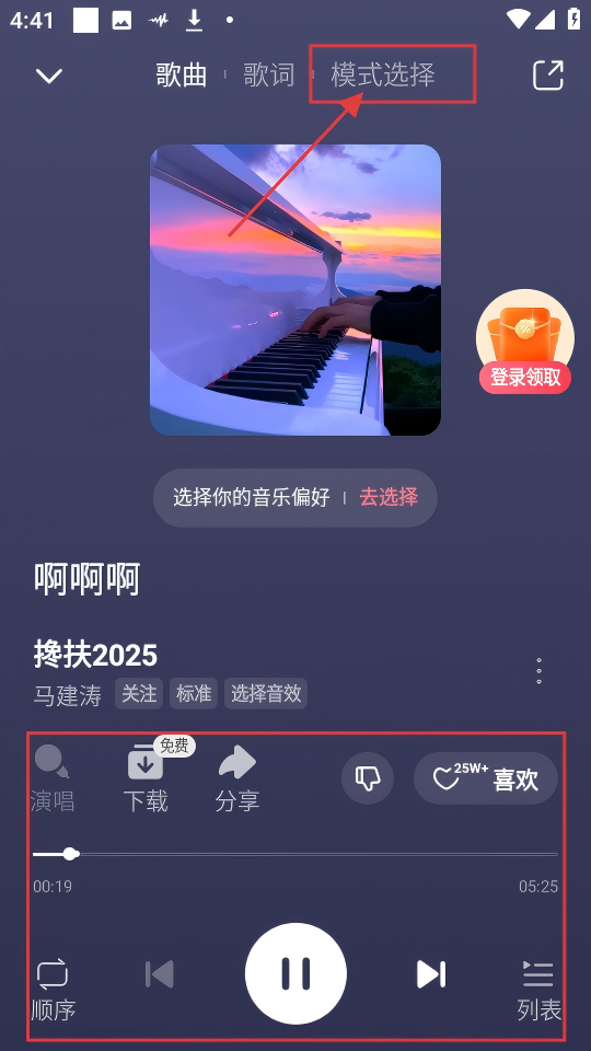 3、播放歌曲时,点击【模式选择】按钮,就能进入模式选择界面,选择合适的播放模式啦。