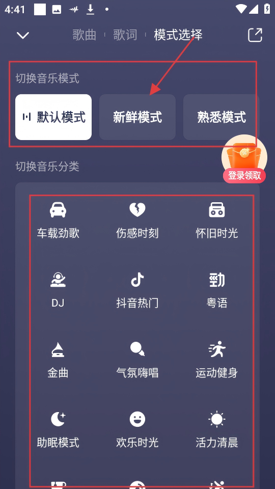 4、在模式选择界面,可切换【默认模式】【新鲜模式】等音乐模式,还能选择【车载劲歌】等音乐分类,打造专属音乐体验哦。
