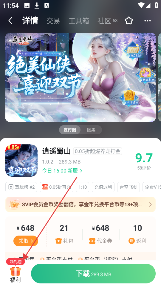 2、进入游戏详情页后,点击【领礼包】按钮,领取游戏礼包,获取兑换码等福利。