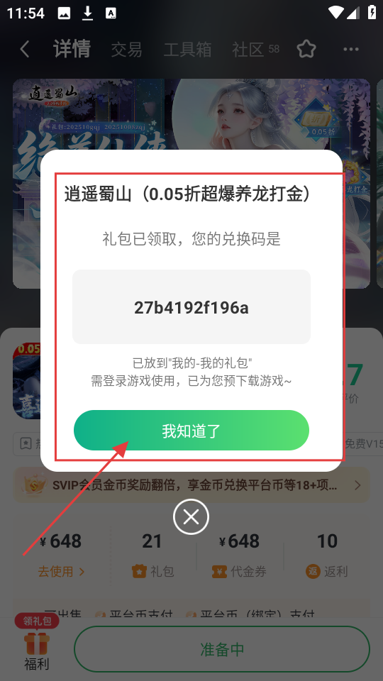 3、领取礼包后,会弹出礼包领取成功的提示框,记住兑换码,点击【我知道了】关闭提示。
