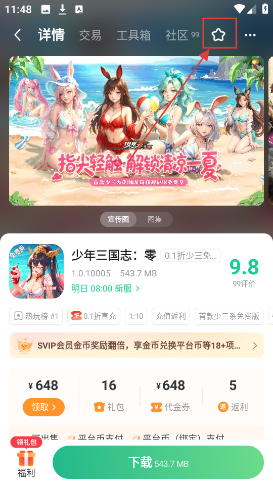 2、进入游戏详情页面后,我们可以点击右上角的星形收藏按钮,将《少年三国志:零》收藏起来。