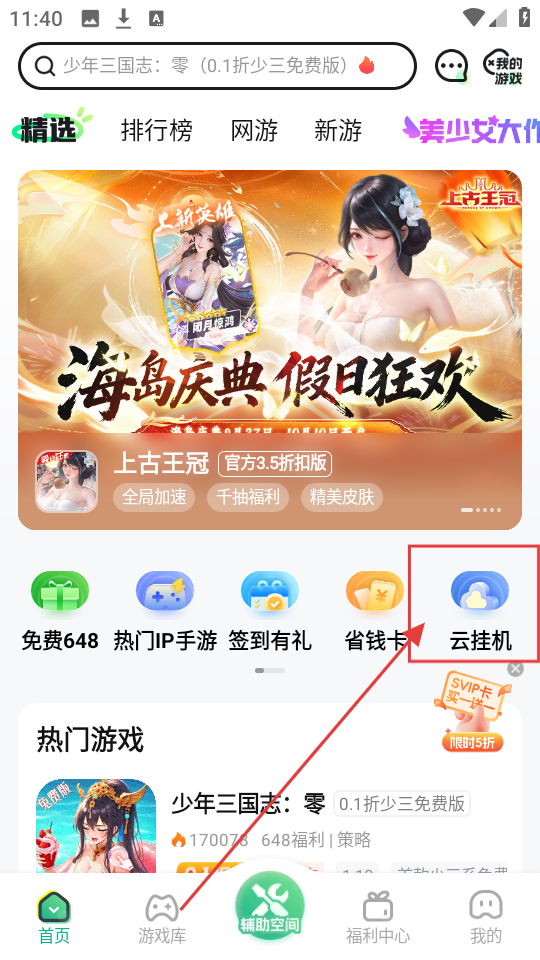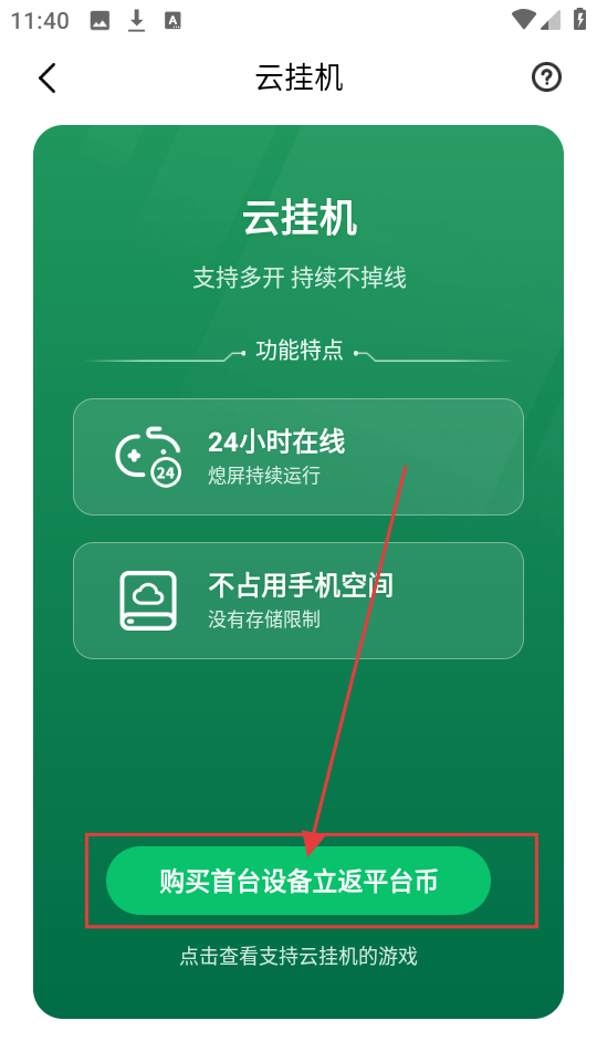 1、在首页找到【云挂机】选项,点击它就能进入云挂机页面,了解云挂机相关功能啦。