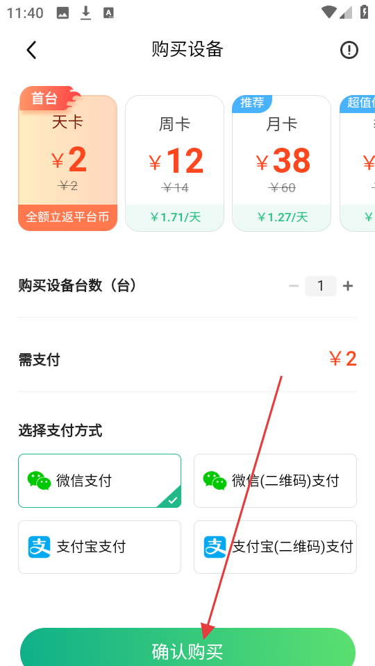 3、在购买设备页面,选择好设备时长、台数和支付方式,点击【确认购买】完成支付。