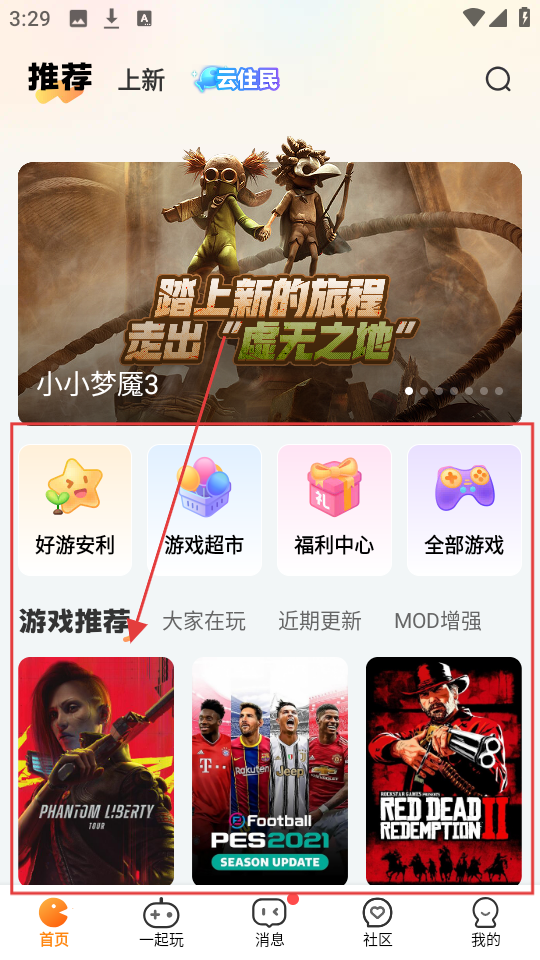 1、我们进入软件,看到推荐的《赛博朋克2077(往日之影)》等游戏,若感兴趣,点击游戏,即可进入详情页啦。