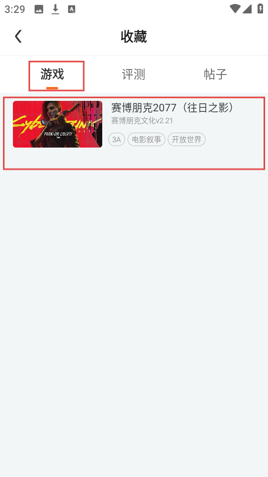 4、进入收藏页面,切换到【游戏】分类,能看到刚收藏的《赛博朋克2077(往日之影)》,点击它,即可继续了解游戏呢。