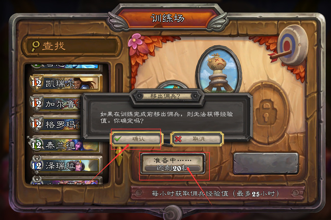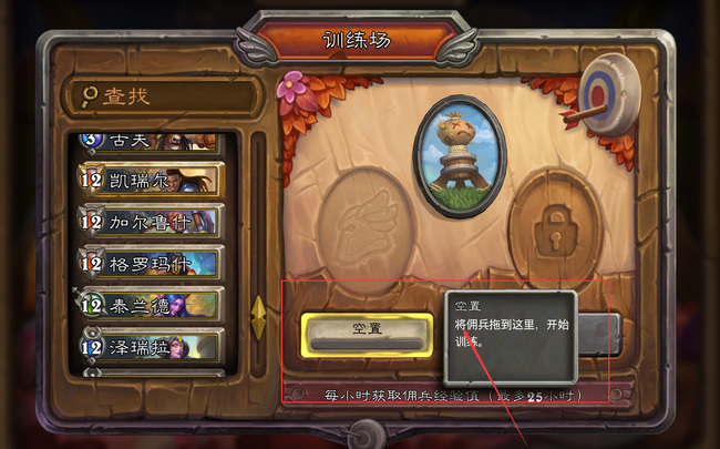 1、玩家进入游戏炉石传说佣兵战纪后,来到训练场,如下图所示,点击玩家自己想换下的佣兵,这样操作后就可以获得该佣兵的经验值;