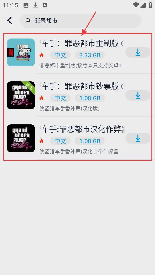 3、搜索后会出现相关游戏列表哦,找到【罪恶都市重制版】就点击进入啦。