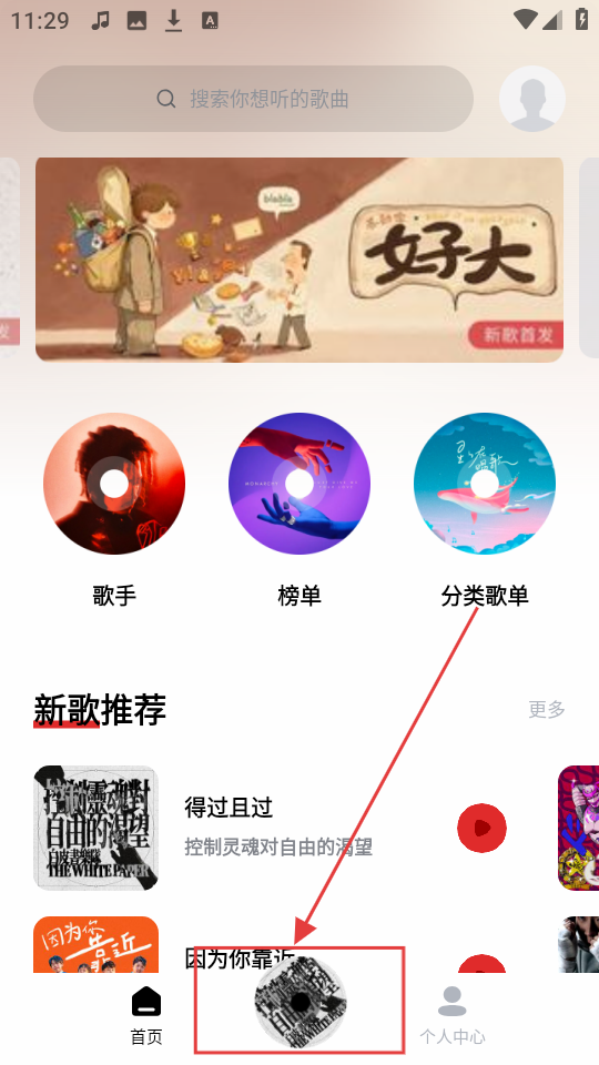 1、进入软件首页后,找到你想听的歌曲,然后点击歌曲对应的播放图标,就能开始播放啦。