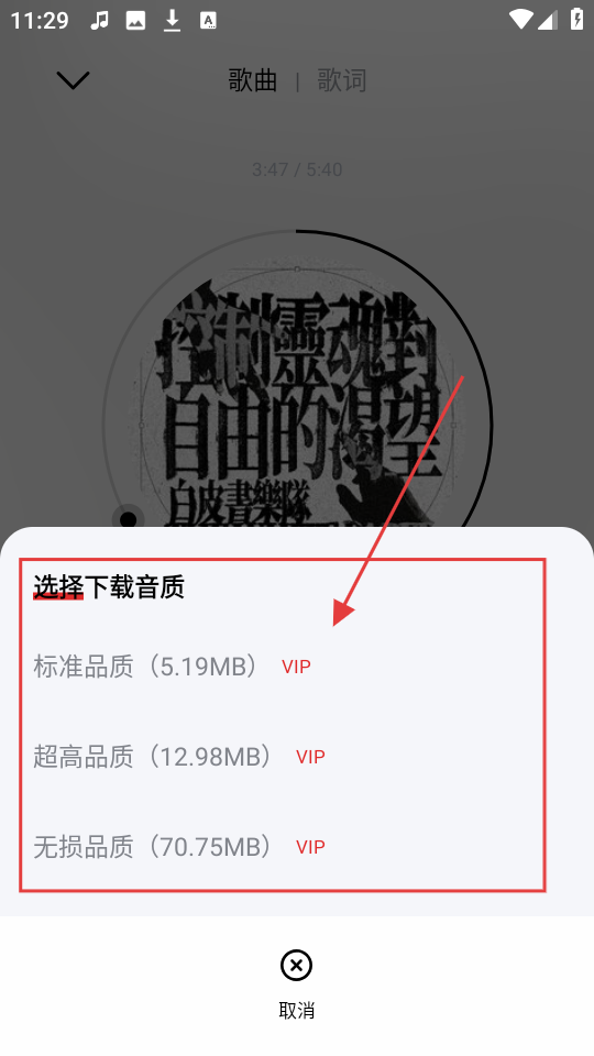 3、点击下载图标后,会弹出【选择下载音质】的选项框,里面有不同品质可选,根据需求选就行啦。