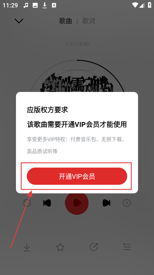 4、要是下载歌曲需要VIP,会弹出提示框,想继续的话就点击【开通VIP会员】按钮去开通吧。