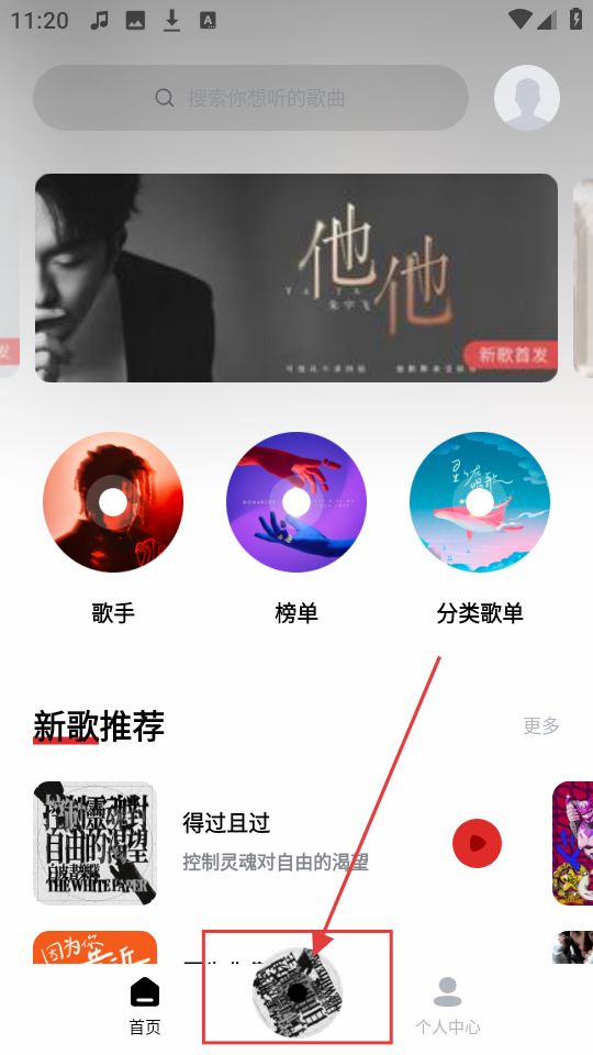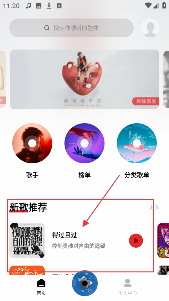 1、打开APP首页,在新歌推荐里选想听的歌曲,比如【得过且过】,点击播放按钮,开始播放歌曲啦。