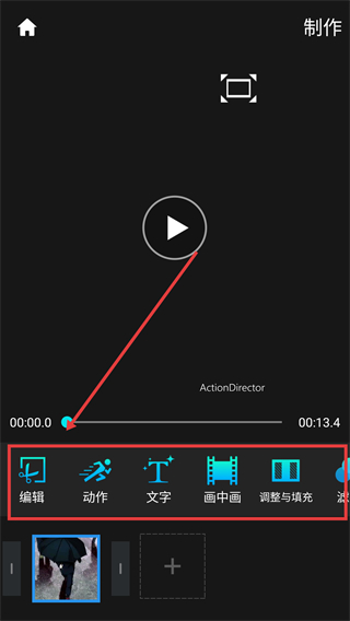 3、进入制作页后,可使用【编辑】【动作】等功能栏,对视频进行各类编辑操作呢。
