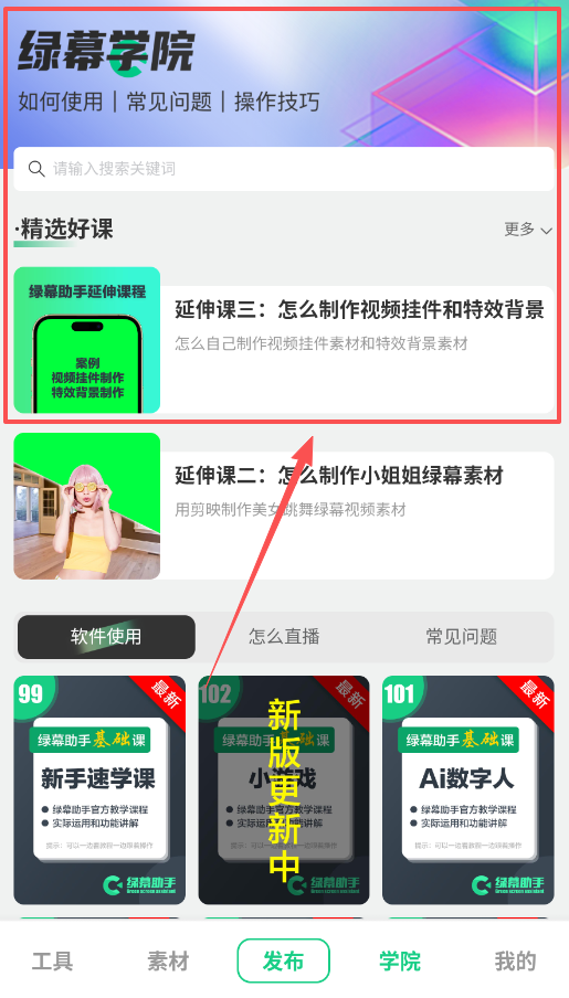 3、利用学院教程快速上手,点击底部“学院”,里面有“新手速学课”和各类延伸课程,就能掌握基础制作技巧了。
