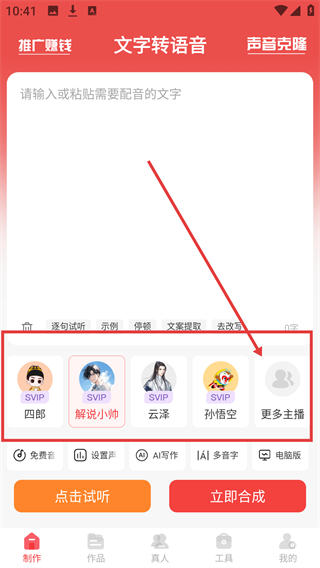 1、在文字转语音页面,输入要配音的文字后,点击【更多主播】按钮,可进入主播选择界面,挑选心仪的配音音色啦。