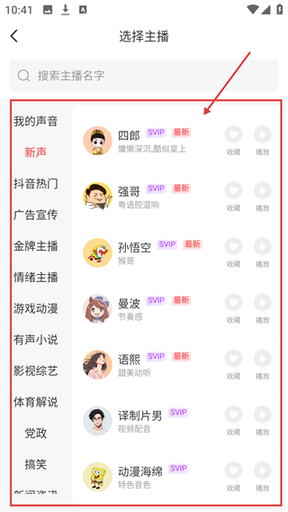 2、进入选择主播页面后,可按分类筛选音色,点击目标主播旁的【播放】按钮,能试听其配音效果哦。
