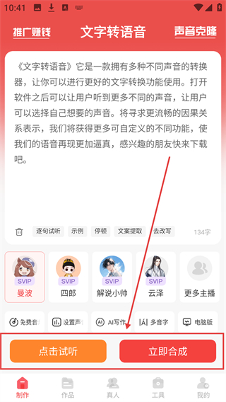 3、选定主播后返回文字页面,确认内容无误,点击【立即合成】按钮,即可生成对应语音内容啦。