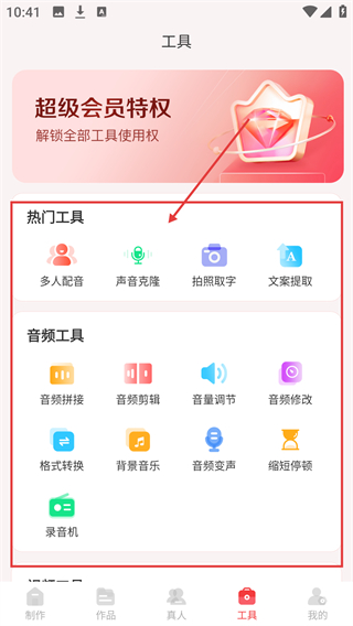 4、切换到工具页面,可使用【多人配音】【声音克隆】等功能,拓展语音制作的更多玩法哦。