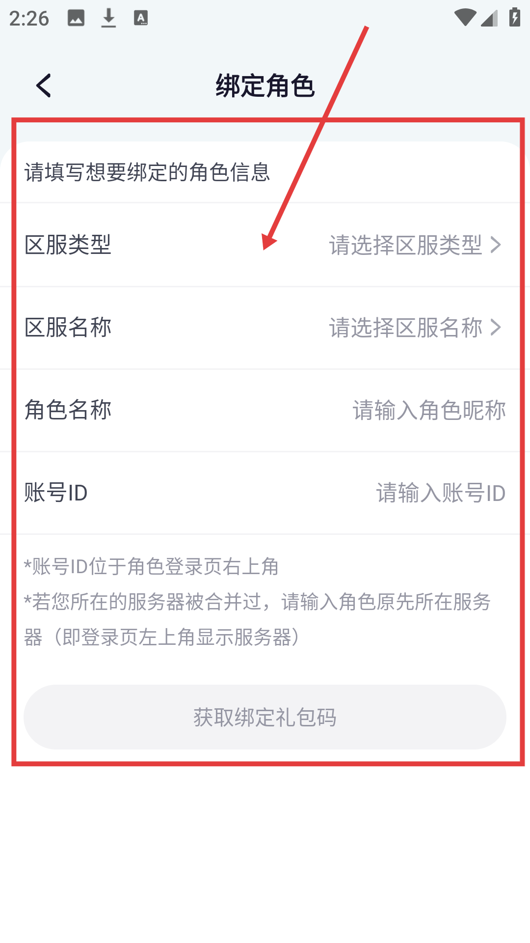 4、在角色信息填写页面,填写区服类型、区服名称等信息,即可完成角色绑定,获取绑定礼包码哦。