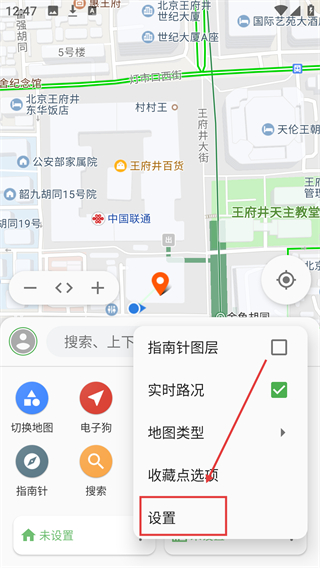 2、在展开的菜单里,选择【设置】选项,进入地图的设置界面,可调整各类功能参数哦。