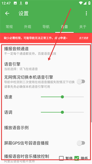 4、在语音设置页,可调整语音引擎、语速、语调等参数,还能设置播报时的音乐控制方式啦。