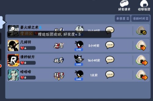 4、成功添加好友后,大家就可以和好友一起互赠饭团,提升亲密度。