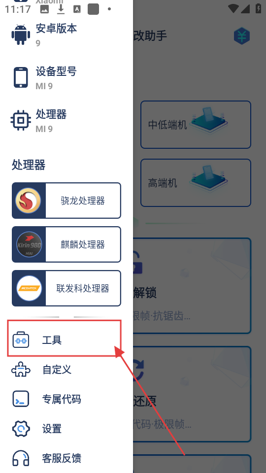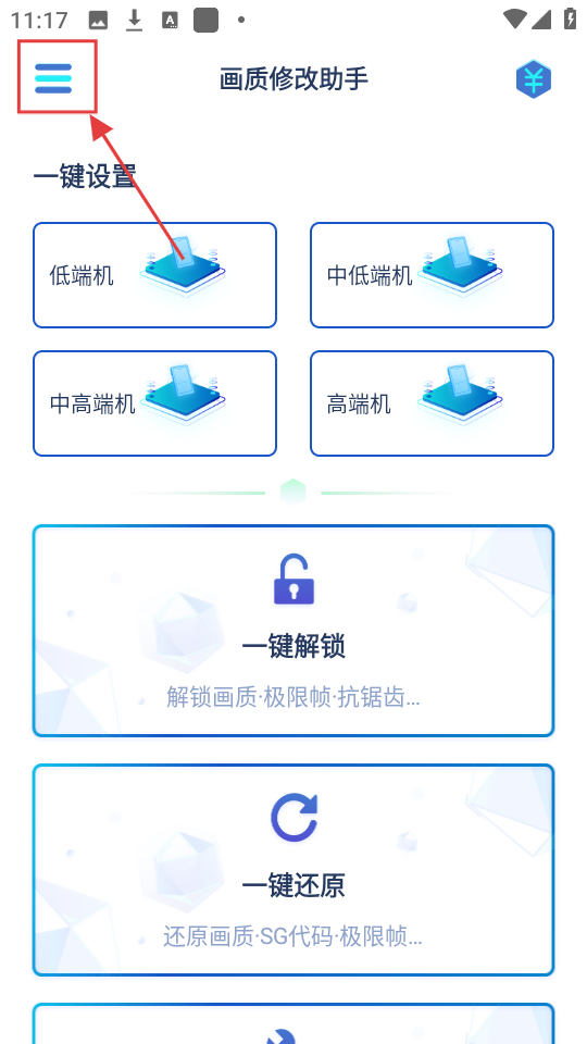 1、打开画质修改助手,想找工具的话,就点击左上角的菜单按钮,展开菜单看看。