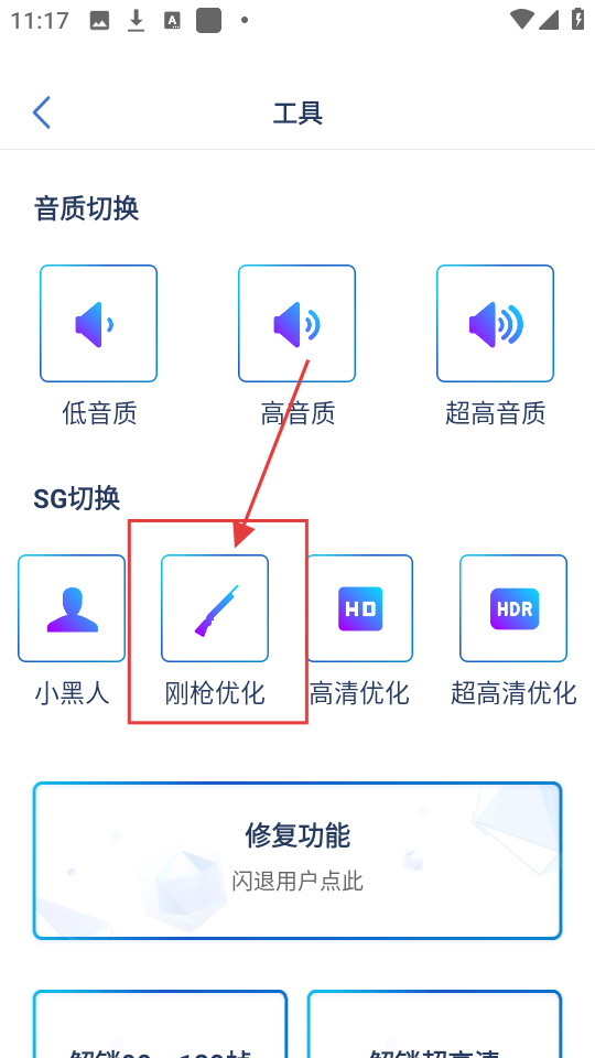 3、到工具页面,能看到SG切换的选项,若想要刚枪优化,就点击【刚枪优化】选项。