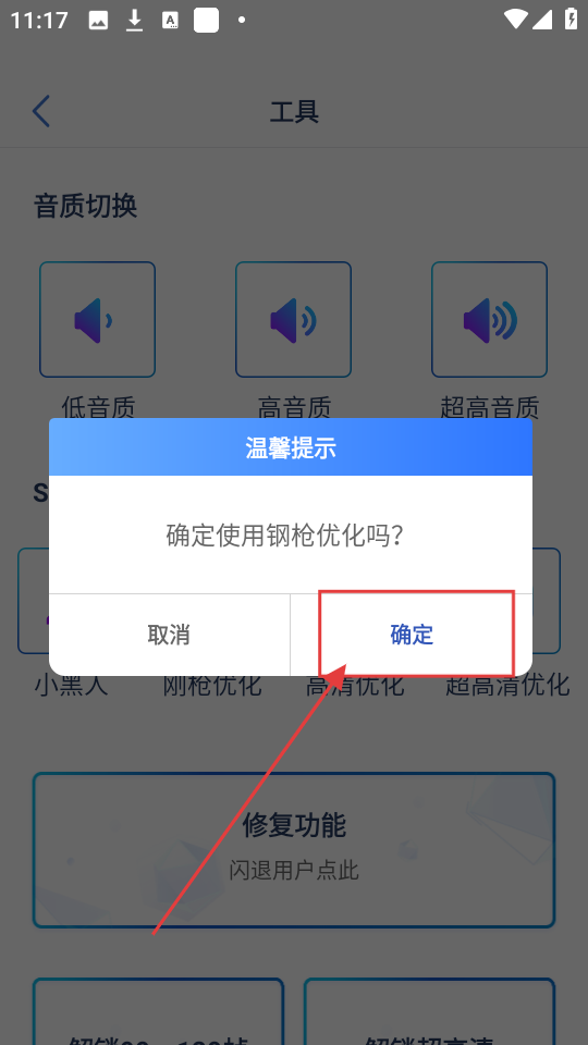 4、点击后会弹出温馨提示,问是否确定使用刚枪优化,点击【确定】,就能开启优化啦。