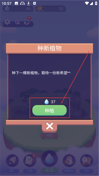 2、在种新植物弹窗中点击【种植】按钮,消耗对应资源(比如37水滴)就能完成新植物的种植哦。