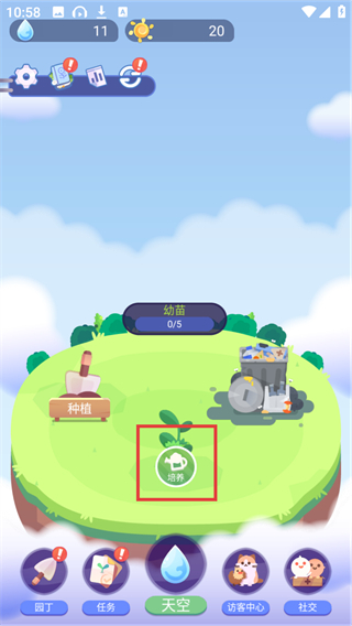4、点击幼苗上的【培养】按钮,就能对幼苗进行培养操作,推进它的成长进度啦。