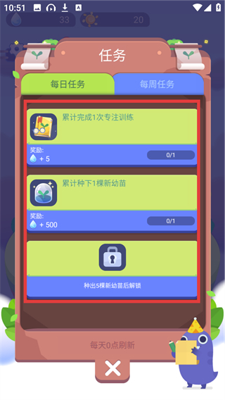 2、在任务页能看到【累计完成1次专注训练】等任务,完成后可获取水滴奖励,助力培育植物哦。