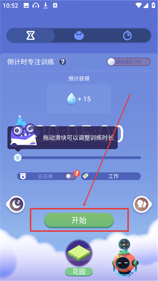 3、在专注训练页调整好时长后,点击【开始】按钮,就能启动专注训练,同时还能获得水滴奖励呢。