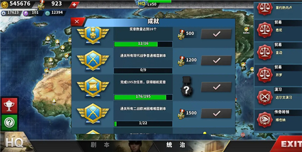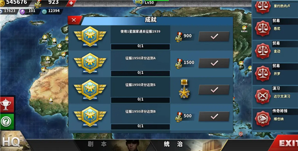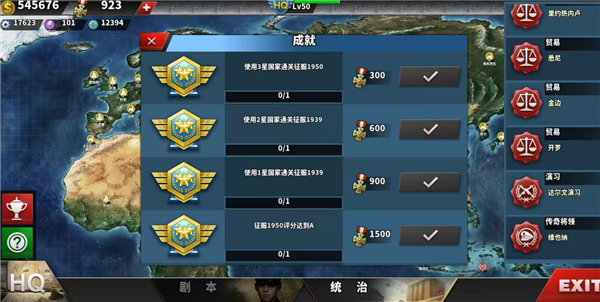成就里用三星国家、二星国家、一星国家第一次通关1939、1943、1950、1980征服都能获得300、600、900勋章,先完成前面相应的征服成就领取其奖励才能获得下一个征服的相应成就奖励,除了1950的冷战征服其它的征服都不难。