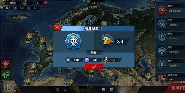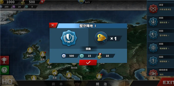 每个挑战有十关,强国梦挑战的奖励是原版的一倍,下关的勋章奖励比上一关多20,也就是每个系列的挑战梦获得1100勋章,4个挑战加一起就是4400勋章,挑战有一定难度,不需要用自己的军团兵。